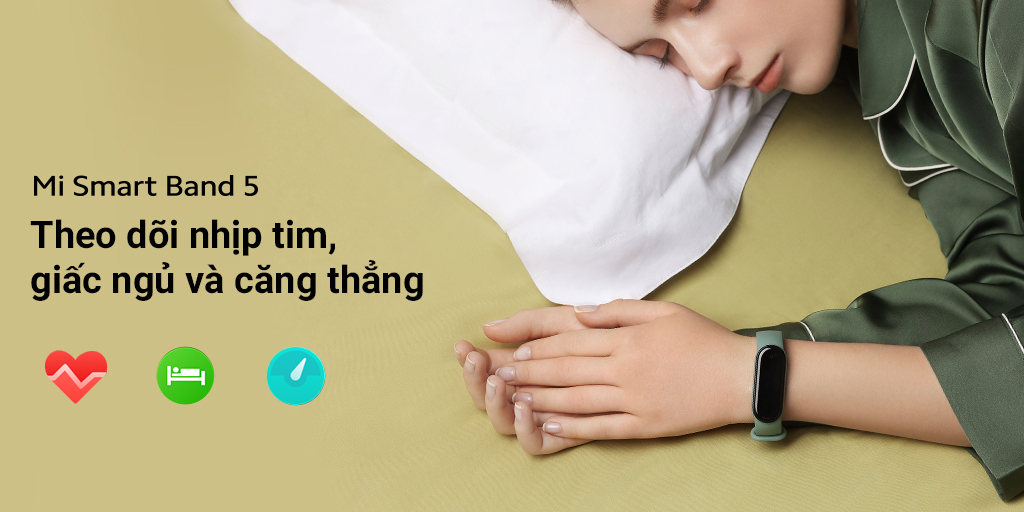 Mi Band 5 hiện đã được cải thiện chức năng theo dõi giấc ngủ, theo dõi nhịp tim liên tục. Giúp xác định các vấn đề về giấc ngủ như ngủ đều, lở giấc và chuyển động mắt nhanh. Dựa trên dữ liệu thu thập được, ứng dụng sẽ cung cấp cho bạn các đề xuất về cách cải thiện chất lượng giấc ngủ của bạn.
